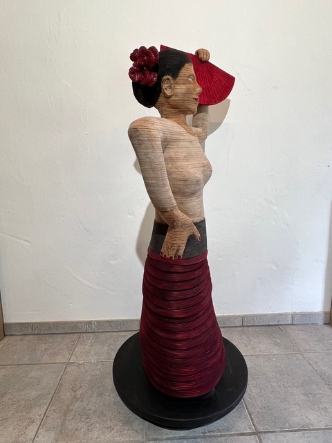 Ihre beschnitzten Holzstelen dienen als Druckstock. Aus den kantigen Holzbalken wird jede Linie einzeln herausgearbeitet. Während des Schnitzens träg sie Farbe auf und druckt diese auf Büttenpapier. So entstehen Druckgrafiken (Reduktionsholzschnitt). Die Plastiken sind der letzte Zustand einer langen Entwicklung. Die Stelen sind ein eigenes Kunstwerk. Die dabei entstandenen Drucke sind Handdrucke und genau wie die Holzstelen Unikate. Für die künstlerische Arbeit beschäftigt sie sich intensiv mit den Göttinnen der griech., röm., nord., Hindu-usw. Mythologie und entwickelt daraus Ideen für ihre Figuren und deren Umsetzung.