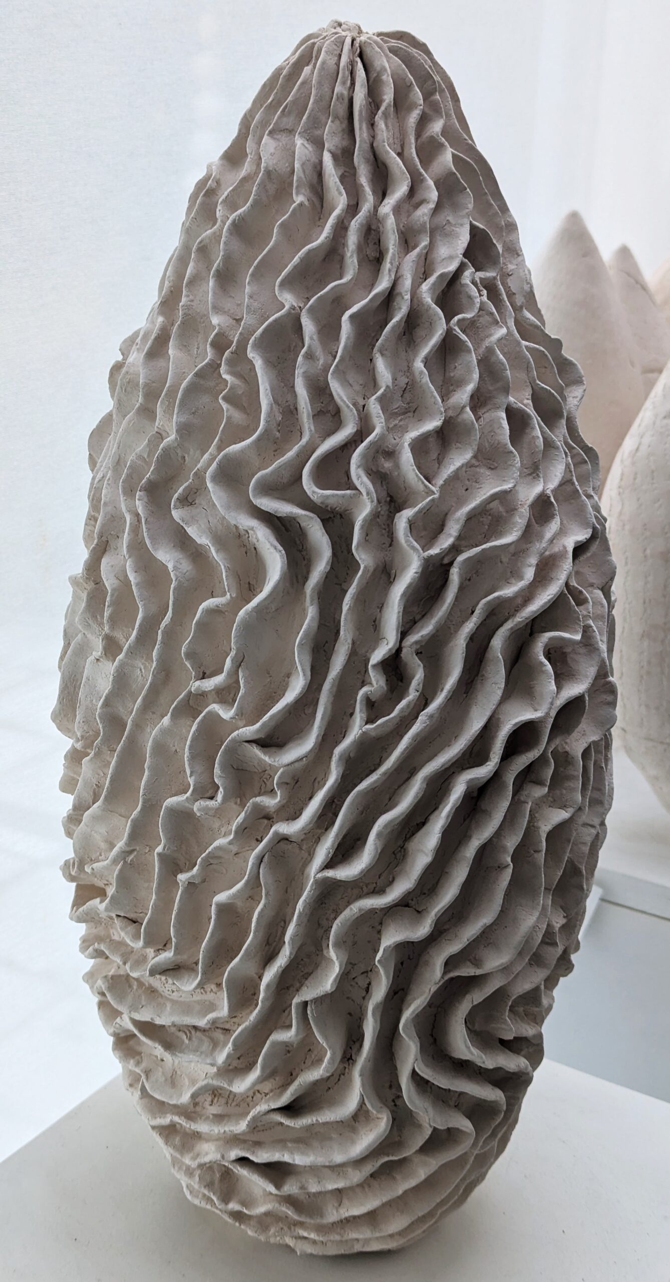 Marie-Gabriele Ahlerts florale Objekte einerseits, abstrakte oft geometrische, strukturierte oder geglättete und polierte Formen andererseits, sind die Schwerpunkte der keramischen Bildhauerin.