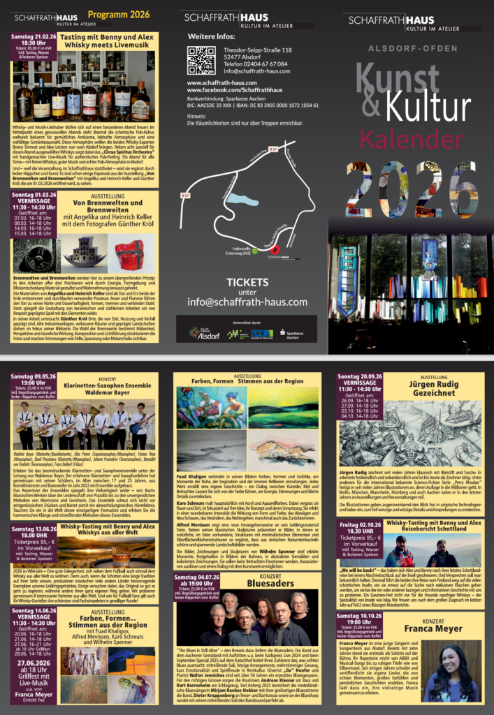 Und – weil die Veranstaltung im Schaffrathhaus stattfindet – wird sie ergänzt durch lecker Häppchen und Kunst: Es sind schon einige Exponate aus der Ausstellung „Von Brennwelten und Brennweiten“ mit Angelika und Heinrich Keller und Günther Król, die am 01.03.2026 eröffnet wird, zu sehen.