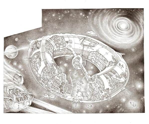 Die Illustrationen geben augenzwinkernd den Blick frei in utopische Technologien und laden ein, zum Teil winzige und witzige Details und Anspielungen zu entdecken.